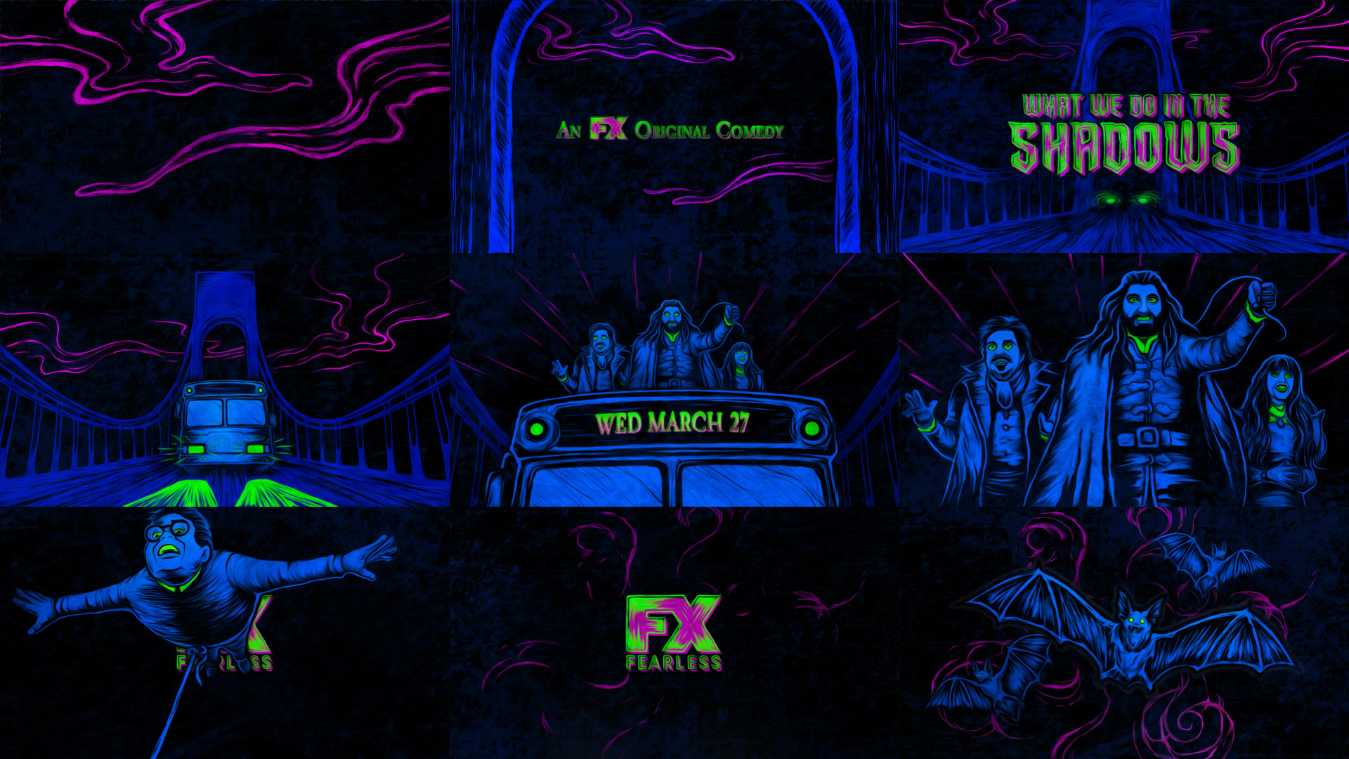 FX was looking to evolve their episodic promo package for the second season of What We Do In The Shadows. The creative challenge was to add a modern twist to classic vampire tropes. I was tasked with creative direction for the pitch, for which myself and a group of talented artists and designers delivered a broad range of design concepts. Ultimately they chose my direction which was inspired by neon, velvet art from the 1970s. Produced at Mocean.